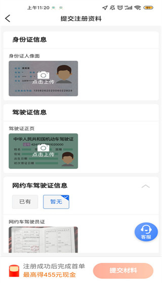 3、点击加入赚钱,需要上传身份证、驾驶证、行驶证等证件资料;