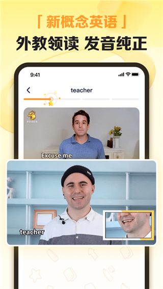 1、外教领读,发音纯正专业外教真人领读,教你纯正的美式发音,从单词到句子,实时智能纠音,提分练口语两不误。