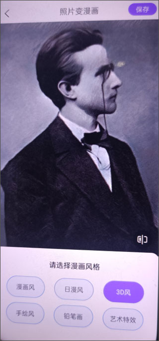 在相册中选择一张照片,然后选择漫画的风格,弄好之后点击右上角的保存按钮即可。