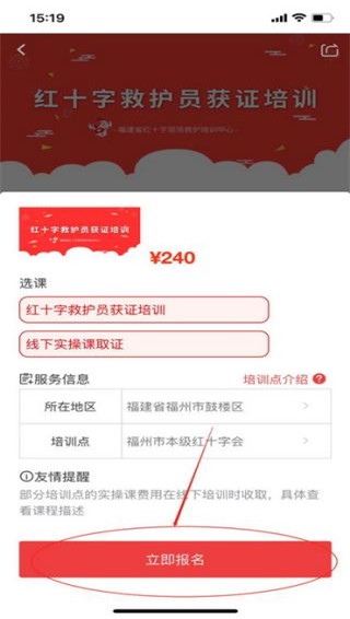 3、选择线下培训“所在地”——“福州市鼓楼区”,培训点选择“福州市本级红十字会”