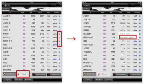 在大厅查找用户,在用户信息窗口点击“Request a Game”发送对局申请