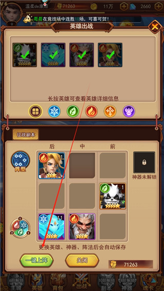 3、在战斗前,需要安排角色上阵,游戏中有一键上阵功能