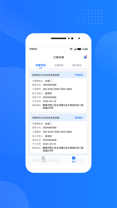 光伏生活服务端的订单列表中有待建项目、在建项目、整改项目功能。用户可以随时随地查看项目的各种信息,如代理商姓名、联系方式、编号等。当出现问题时刻通过这些功能快速联系到负责人,解决问题。此外,软件中还有查看设计图、主屋基本信息、线缆安装、完工订单等功能。有需要的朋友快来本站下载软件使用吧。