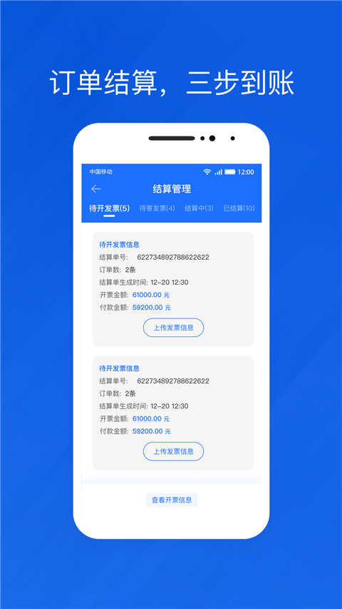 3、上传结算的发票信息,在查看结算订单信息的时候能使用其中上传发票信息功能上传;