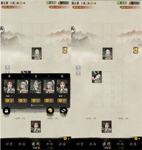 1、备战状态招募与上阵。进入主线关卡后,点击界面中的【继续】按钮即可开始进行关卡战斗。点击【继续】按钮后,即进入备战状态。备战状态会首先弹出招募窗(如下图一),主公需要根据自身所有拥有的军饷(沙盒资源)数量来招募对应的武将。招募后的武将出现在备战区(如图中马岱的所在位置),如果需要将该武将上阵,可以手动拖动武将卡片到对应的出战区(如图中张任所在位置),双击卡片会自动上阵该武将。点击【出战】按钮后开始战斗。战斗过程为全自动战斗,无法手动发动技能。