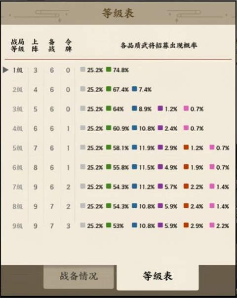 使用军饷可以升级战局等级,不同的战局等级可以提升不同品质武将在招募列表的刷新几率。下图的等级表中可以查看各品质武将的出现概率,其中白色代表杂兵,绿色代表良将,蓝色代表名将,紫色代表稀世,橙色代表绝品,粉色代表美人。未达到对应品质武将出现战局等级要求的,不会在招募列表中刷新到对应品质的武将。