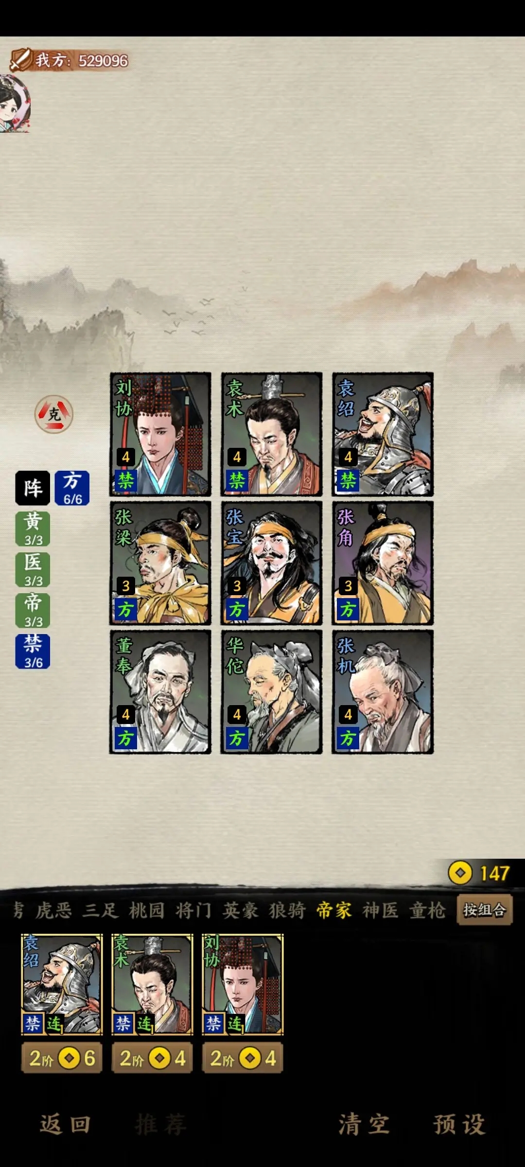 阵容解析:平滑的合成阵容,拥有不俗的功能性。三禁的坦度较高,加上三医的回复,可以说只要还剩一口气都能回满。黄巾限制输出和辅助也有不俗功效,前期推图集卡也十分平滑。