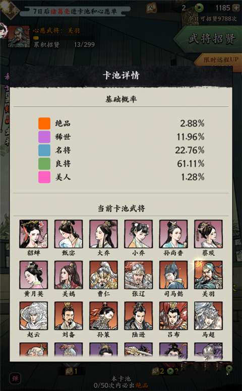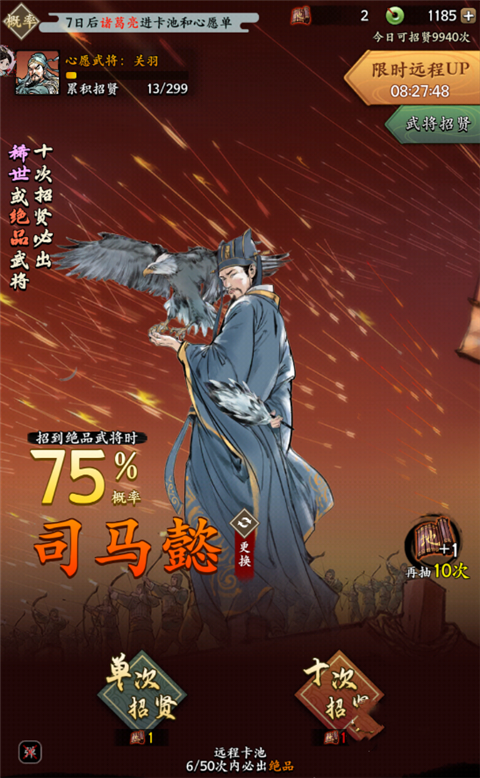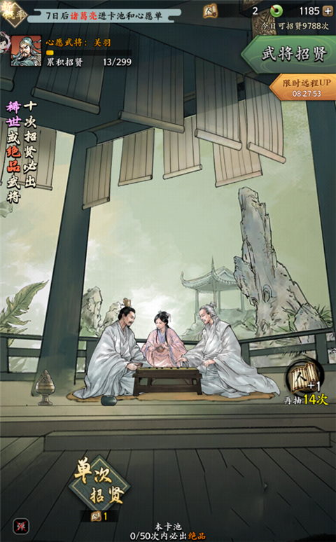 2、而在你们将这个设定为心愿的武将抽到之后,是可以将其换一个再进行抽取的。此处想更快获取高品质的武将,那么就需要进行十连,此处是有保底的,最多抽取五十次便会出绝品的武将,如果你运气好,那么就会更快获取。