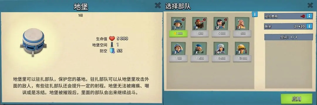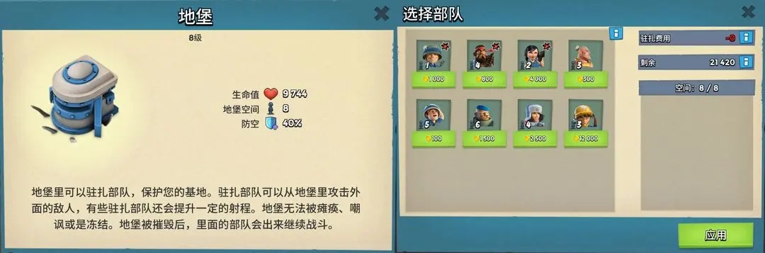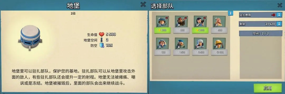 地堡建筑介绍地堡里可以驻扎部队,保护您的基地。驻扎部队可以从地堡里攻击外面的敌人,有些驻扎部队还会提升一定的射程。地堡无法被瘫痪、嘲讽或是冻结。地堡被摧毁后,里面的部队会出来继续战斗。