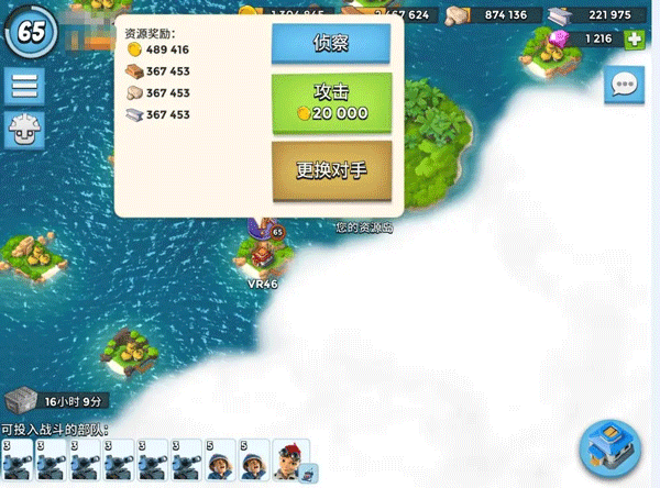 12、随着地图的扩大,可以看到很多其它玩家占领的岛屿,打败这些玩家占领岛屿后就可以一次性获得玩家岛屿的近半数资源,所以占领敌方岛屿是获得资源的最快的方法,但也存在着敌方岛屿数量太少或者等级太高的问题。