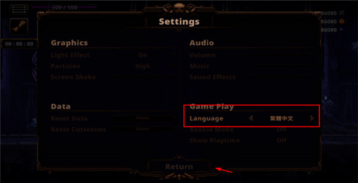 3、找到Language语言设置,将语言切换为繁体中文(目前没有简中),然后点击Return确认。