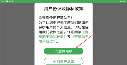 1、第一次进入野草助手需要阅读各种注意事项,阅读完成后点击【同意并继续】