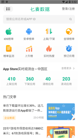 1、App榜单:七麦数据app最新版提供iOS&Android双平台榜单实时查询,最新排名、变化趋势、竞品榜单动态一网打尽,且数据更准确、更全面2、AppStore总览:每日上线/更新/删除应用数量、榜单更新时间、审核时长、关键词搜索结果变化率,多维度AppStore数据应有尽有