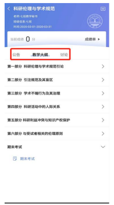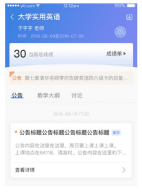 点击任意课程进入课程学习页面,课程学习页面顶部显示课程名称、班级名称、老师名称、开课学期等基本信息,功能区分为“公告”区、“教学大纲”区、“讨论”区三个区域。教学大纲展示课程章节,每一章节中有各种学习单元可供学习。学习某个单元后,教学大纲页面将展现学习进度,方便查看自己已经学习完或正在学习的单元,快速定位。