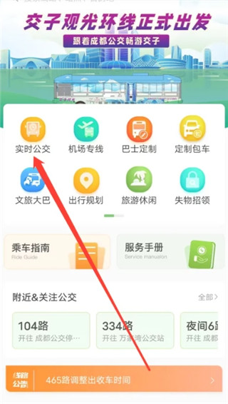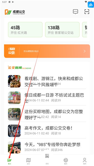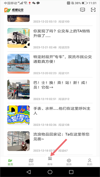1、用户打开登录成都公交后进入首页处点击底部中间的【乘车】(下图红色箭头所指)