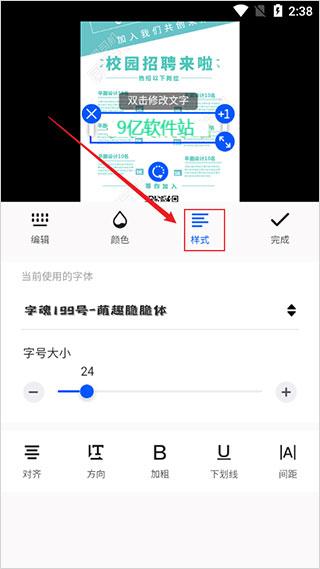2、进入模板编辑页面,点击底部的加字选项;