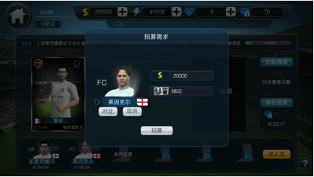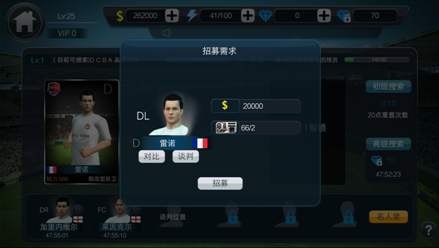 1、球员招募在球探的搜索里面,球员的等级分为D、C、B、A、S、-S、S+,想要获得等级高的球员,就必须要升级球探等级,等级越高,出的球员也就越好!用绑钻或者钻石搜索,可以出比该等级高一级的球员。初级搜索除了每天相应的次数外,还会在13点和20点重置次数哦。