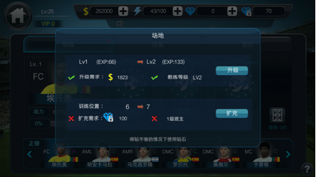 4、升级球员前,一定要先升级场地(在球员养成里面),场地最高是50级,这个在金币多的情况下,最好是升级满,不然球员经验升级很慢,对球员后期的成长有很大的影响。