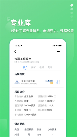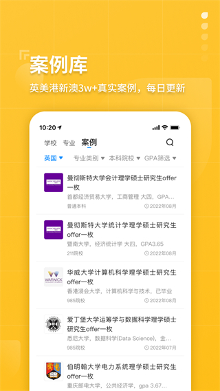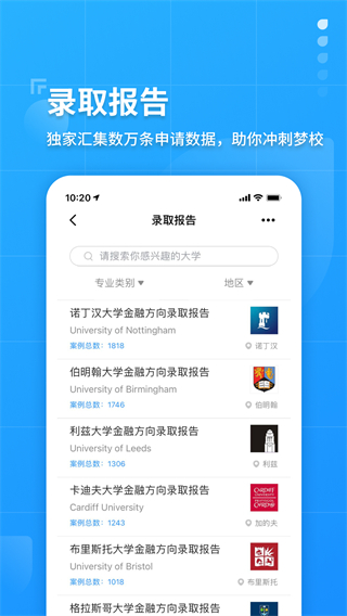 1、【海外院校专业排名】搜集学院校专业库,全面掌握选校信息。2、【出国留学成功案例】看海量指南者案例,知悉名校录取攻略。