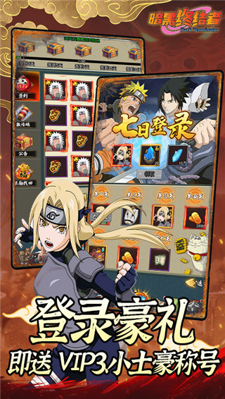暗黑终结者最新版是一款火影为主题的放置挂机战斗游戏,在游戏中,玩家作为一名忍者村的忍者,需要抵抗来自邪恶势力的入侵,结合大家的力量,将其赶出村子,但是这些势力并没有根除,有朝一日还会再回来,因此玩家们需要不断提升自己的能力和忍者技能,招募更强大的忍者伙伴,才能保卫村子的安全!该游戏具有丰富的游戏玩法,如忍者养成、忍术修炼、多人组队副本等,华丽的忍术特效和原汁原味的配音,更让玩家身临其境地投入到游戏世界中。