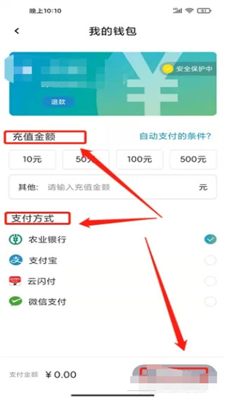 进入我的钱包界面,选择充值金额、支付方式,点击【确认支付】。