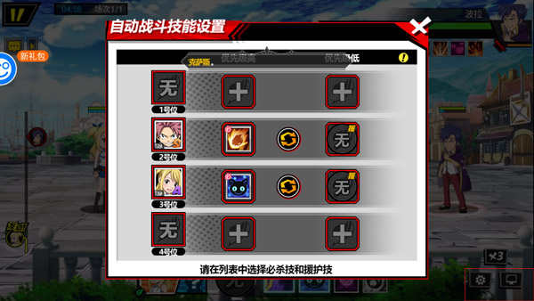 5、在设置安扭中,可以自动战斗技能的设置,设置完成后点击右方自动战斗按钮,即可开始自动挑战