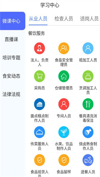 进入课程模块后,根据培训人员相关属性,选择相关类别人员学习课程。如点击“从业人员”或“检查人员”,可看到餐饮行业从业人员和检查人员相关培训课程,点击相应课程,即可进入“课程列表”,点击课程列表中的课程,进入课程的学习。