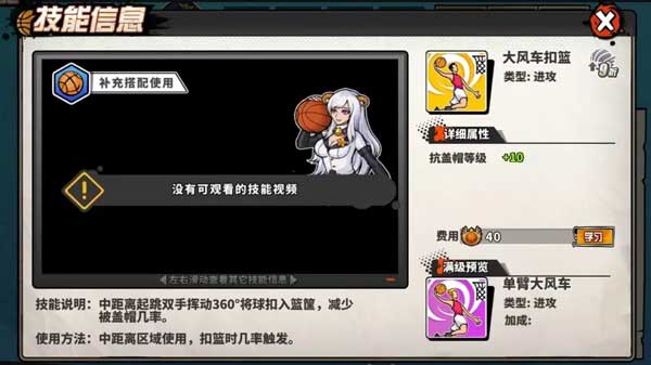 [大风车扣篮]中距离起跳双手挥动360度将球扣入篮筐,减少被盖帽几率。,提升抗盖帽等级。