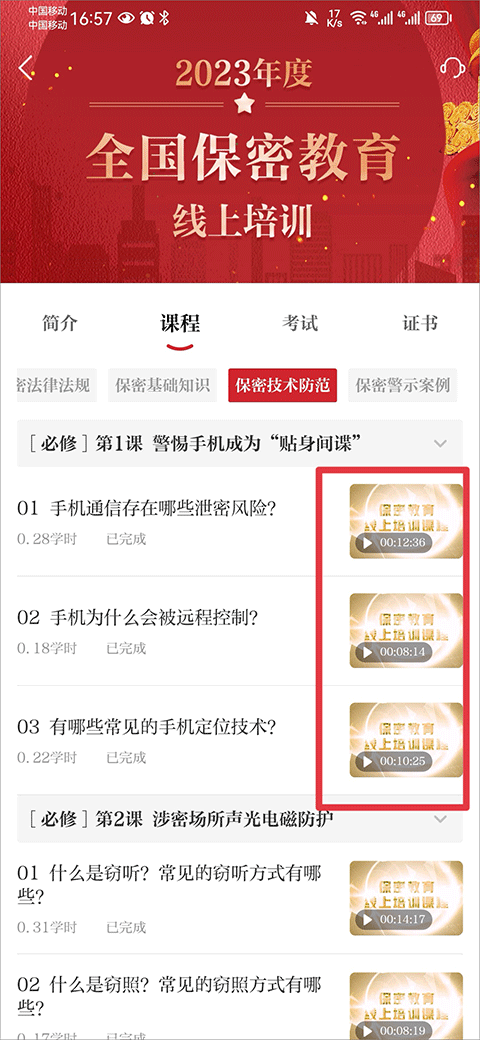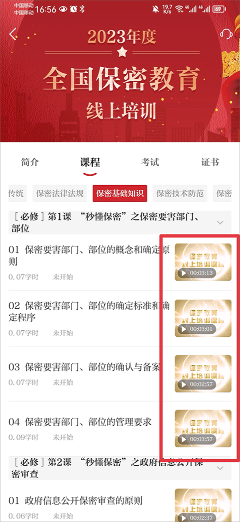 2、进入培训课程界面中时,在每个视频的右下角都带有视频走过时长,显示1-2分钟的直接将进度条拖到最后就行