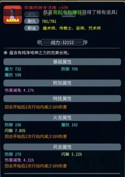 水龙袍以二回合行动-10%伤害特技为基础,减伤副属性为宜,火龙袍以二回合行动-10%特技为基础,高防御、高魔抗属性为宜,风、地龙袍以二回合行动-10%特技为基础,伤害减免、魔法减免、物理减免属性为宜。