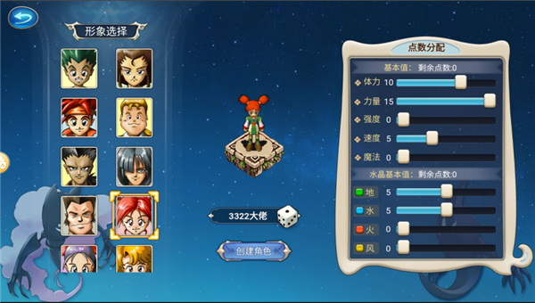 2、选择你需要创建的人物形象,并对其创建一个游戏名称,在旁边还可以分配人物的点数;