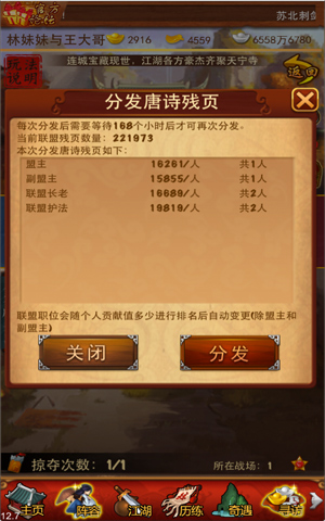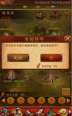 要想获得连城宝藏, 需闯过其他联盟的防守,交战之时一方进攻,一方防守,各位掌门誓死守护联盟荣誉,更可由此踏入更高一级战场,新的交锋一触即发。而最终胜利的一方将获得对方联盟全部的“唐诗残页”。“每周结束后,联盟内的“唐诗残页”都按比例分配给每个联盟成员,每个成员获得残页数量将根据本周的累计贡献多少计算。”
