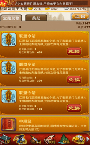 价值连城的宝藏藏于天下无敌的《连城剑法》中,谁能不动心?此宝藏中不仅有着富可敌国的财富,其内藏的绝世武功更是引得江湖中人刀兵相见,纷纷前往寻找!由于宝藏数量过多,地点过于险要,非一人之力所为,需集合众多侠士方能取得,为此请各位掌门组成联盟,且联盟等级达到4级之后,会自动开启寻宝入口,各位掌门可点击前往开始夺宝之旅。