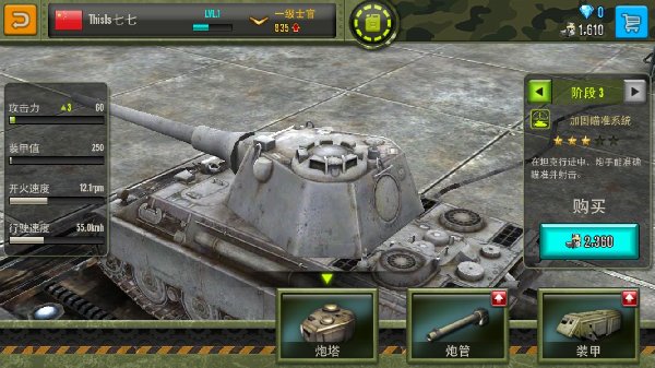 点击兵工厂,选择升级炮管,用军费,等待1小时升级完毕后安装,等级越高升级花费的时间越多。建议军费达到两万立马换掉水蛇买图中的箭鱼,箭鱼前期速度快,发炮快,可以获得更多军费和钻石。水蛇少打分多捡钱,然后按照箭鱼、天鹰、狐狸的顺序换车,多抢夺(用天鹰),狐狸升满,够4500钻后冲兽,可能要很长时间,但是你就不会被虐了,水蛇,箭鱼,天鹰,天猫,天蝎慢慢打,基本上升满吧,有的车装甲升到7 8级就好了,前几级平均升,后期主升引擎和履带,先把速度升起来,然后升炮塔和炮管!