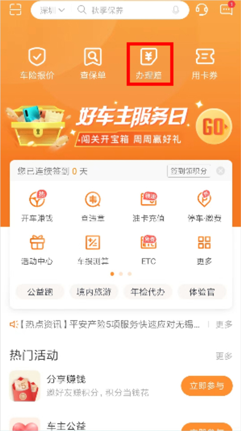 您可以在平安车险app首页点击“办理赔"进入