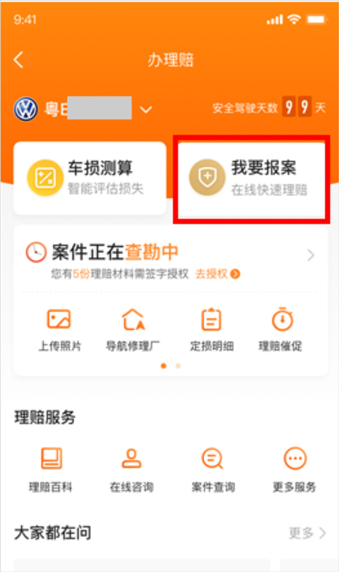 第一步:进入办理赔首页,点击“我要报案"按钮