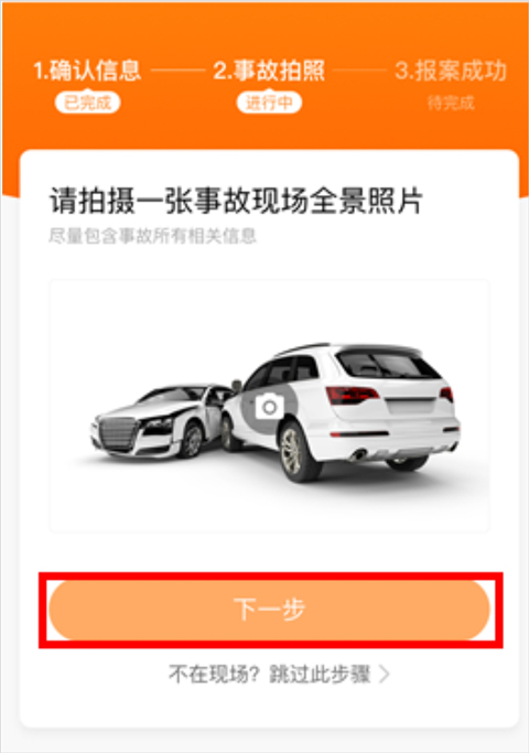 第三步:上传一张事故全景照片(尽量包含事故所有相关信息),然后点击“下一步"按钮即可报案成功