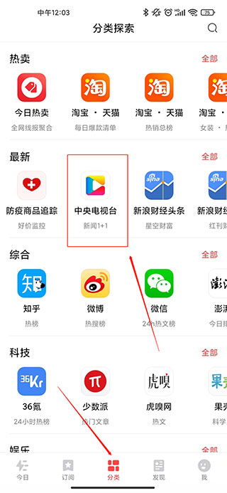 1、进入今日热榜app,点击分类选项,找到中央电视台