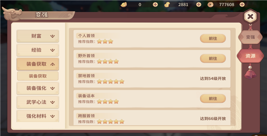 等级升上去了,各位侠士就需要换上更加强力的装备,才能面对江湖中更加凶险的挑战!在手游中,当前版本装备有白[凡]、蓝[下]、紫[中]、橙[上]、红[神]六个品质级别。通过剧情任务,可以轻松获取低品质的装备,而想要更换更好的,就需要通过Boss首领、江湖秘境等方式获取了!在这里,小编推荐各位务必先从首领刷起,先凑一身打底装备,然后再向秘境首领发起挑战。当然,各位还可以通过交易行,购买自己需求的极品装备。如果仍有不明白的地方,可以通过“变强-资源-我要装备”查询详细的装备掉落信息。