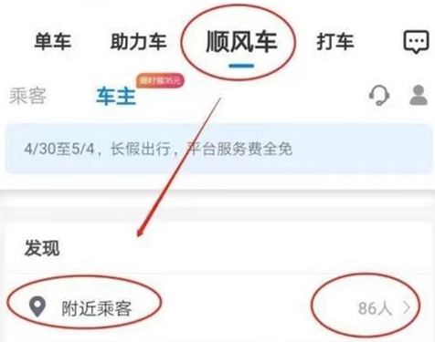 1、进入软件页面,找到顺风车界面,点击顺风车,在页面里点击车主,然后点击附近乘客