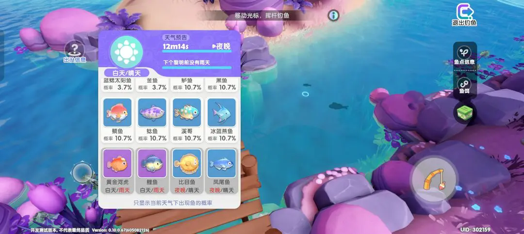 在钓鱼界面出没信息,可查看天气。夜晚钓鱼任务,不是在夜晚钓鱼,而是要钓出只在夜晚出现的鱼(下雨同理)