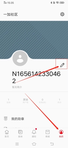 1、进入一加社区app后,首先点击右下角“我的”,之后再点击昵称上方的“铅笔”按钮;