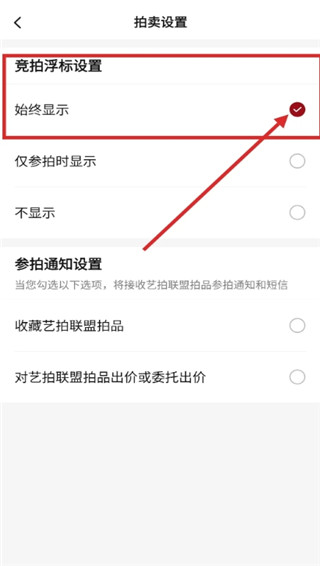 在“竞拍浮标设置”选项里,点击“始终显示”,设置完成。
