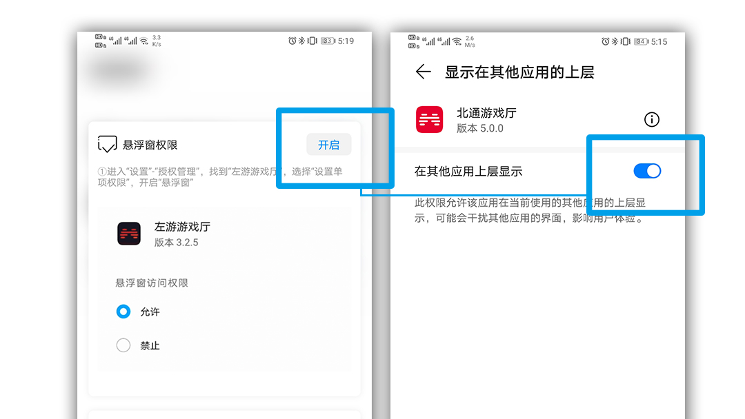 2、点击悬浮窗权限的开启按钮,打开在其他应用上层显示。