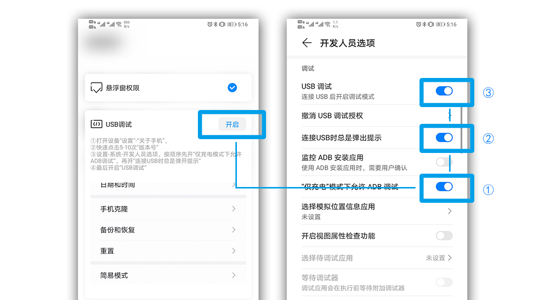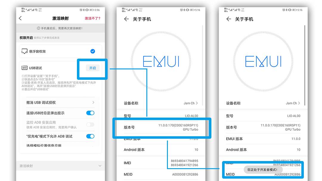3、点击“USB调试“的开启按钮,跳转至系统说明界面,连续、快速点击【版本号】5-10次,开启开发者选项。