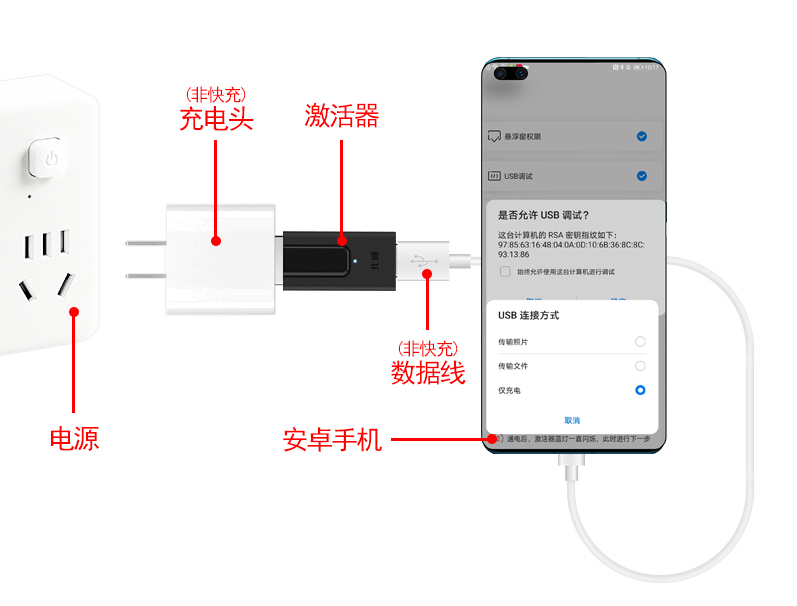 5、将电源、激活器、手机如图所示连接起来,手机弹出USB连接方式,选择仅充电,手机多次弹出是否允许USB调试?均选择允许,手机显示“正在激活中”,自动进入app首页,即完成激活。