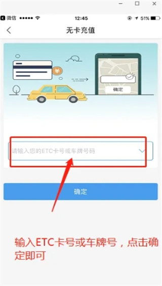 7、在无卡充值点击进入之后,输入ETC卡号或者车牌号码,点击确定即可进入充值页面进行充值,完成充值即可。