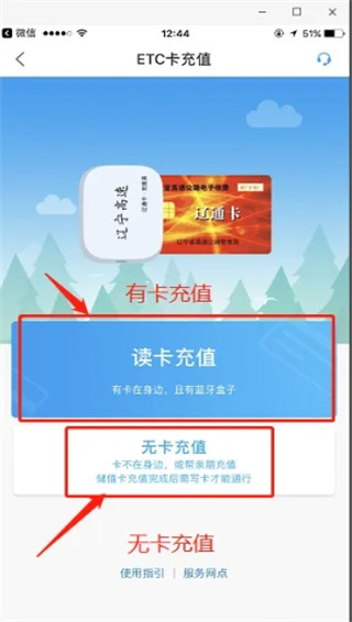 6、在充值页面有两种选择,a、身边有卡,有蓝牙盒子,即可读卡充值,b、身边无卡,或者没有蓝牙盒子,选择此项。
