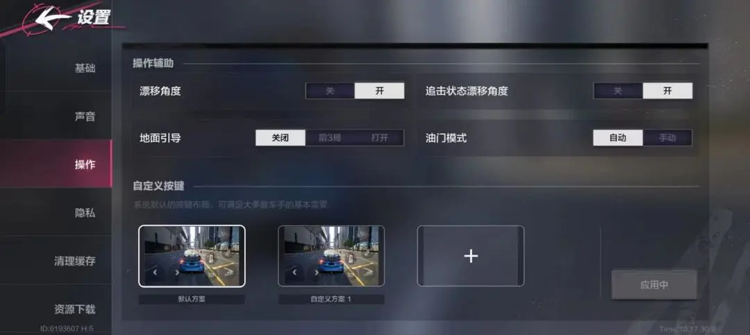 操作菜单:可以对操作辅助进行设置,其中:“漂移角度”、“追击状态漂移角度”指示器建议开启,可以更方便的控制漂移角度;“地面引导”是任务路径的引导,也建议初入热湾的车手们保持开启;“油门模式”可以选择自动或手动,建议成为老玩家以后再选择手动油门,可以更自由的控制车辆。