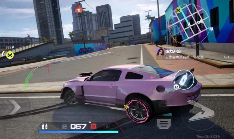 2. 惯性漂移:适用于小角度高速弯道,是游戏中的基础漂移技巧,只有在车速达到160km/h以上才可触发,操作方法为:1按住方向键的同时,先点击脚刹、再点击油门。此时角度标尺区间显示为白区,增加漂移角度即可变为绿区。